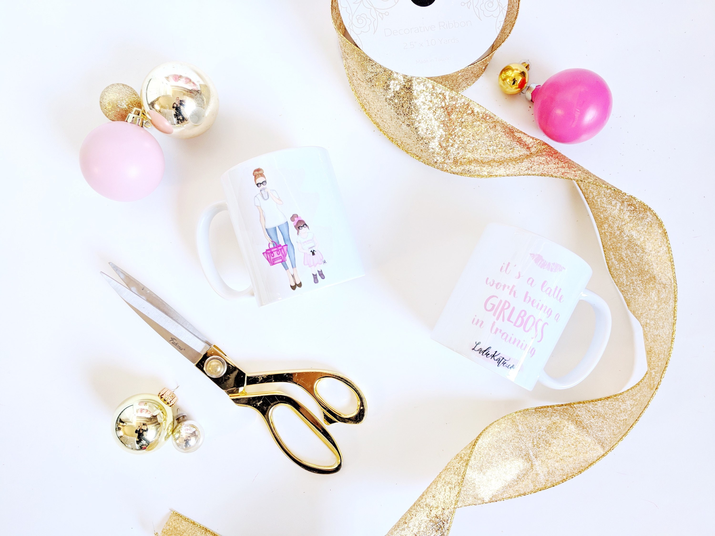 Hair in a topknot, drinking girl boss fuel, with her mini me, this girl power mug is available in 4 different options--please select the number of the girlboss and girlboss in training that best represents you from the dropdown menu.